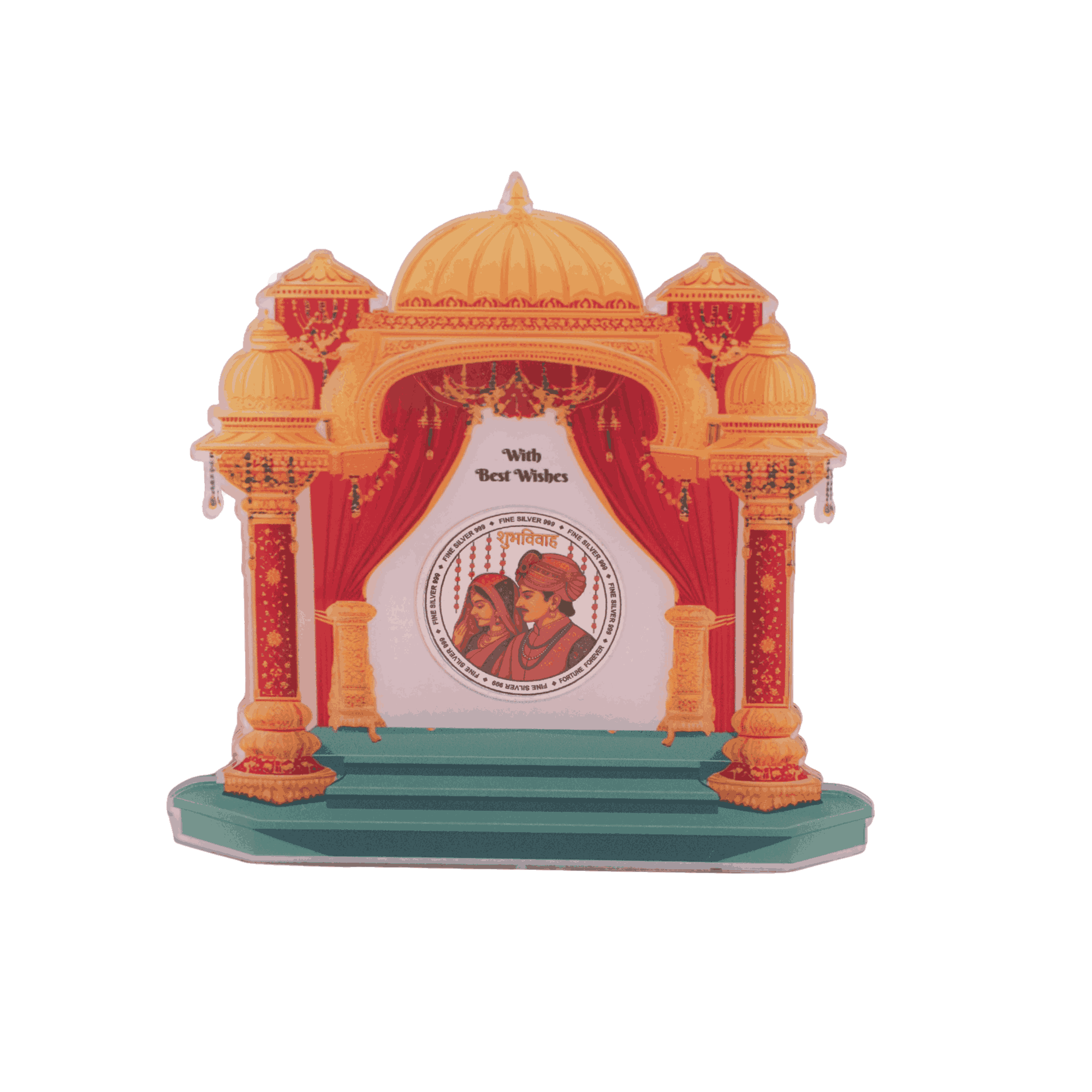 Elegant 999 Pure Silver Coin designed with a royal wedding mandap theme, symbolizing love, unity, and शुभ विवाह आशीर्वाद.