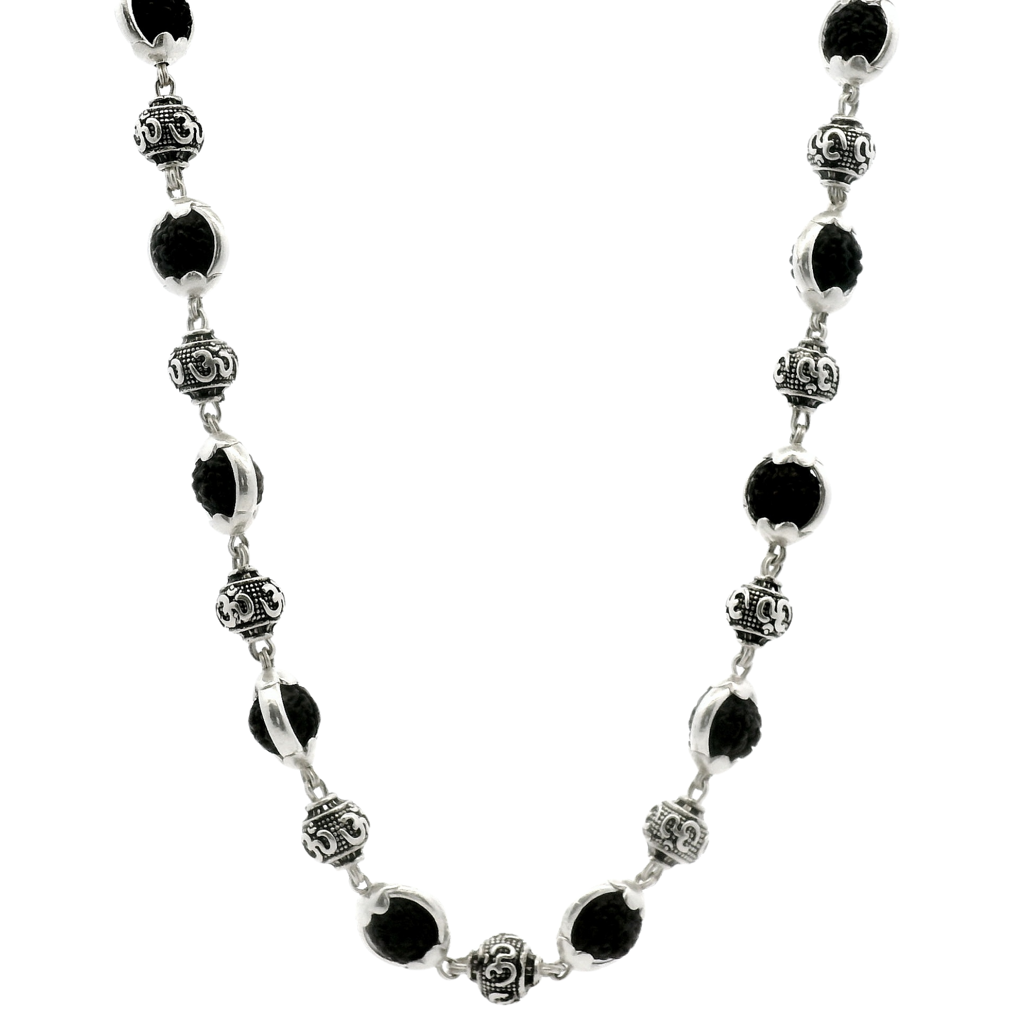 A powerful Black Rudraksha Necklace with Oxidised Silver OM Beads, designed to symbolize protection, spiritual strength, and divine energy. A perfect blend of sacred Rudraksha beads and traditional OM symbols for daily spiritual wear.