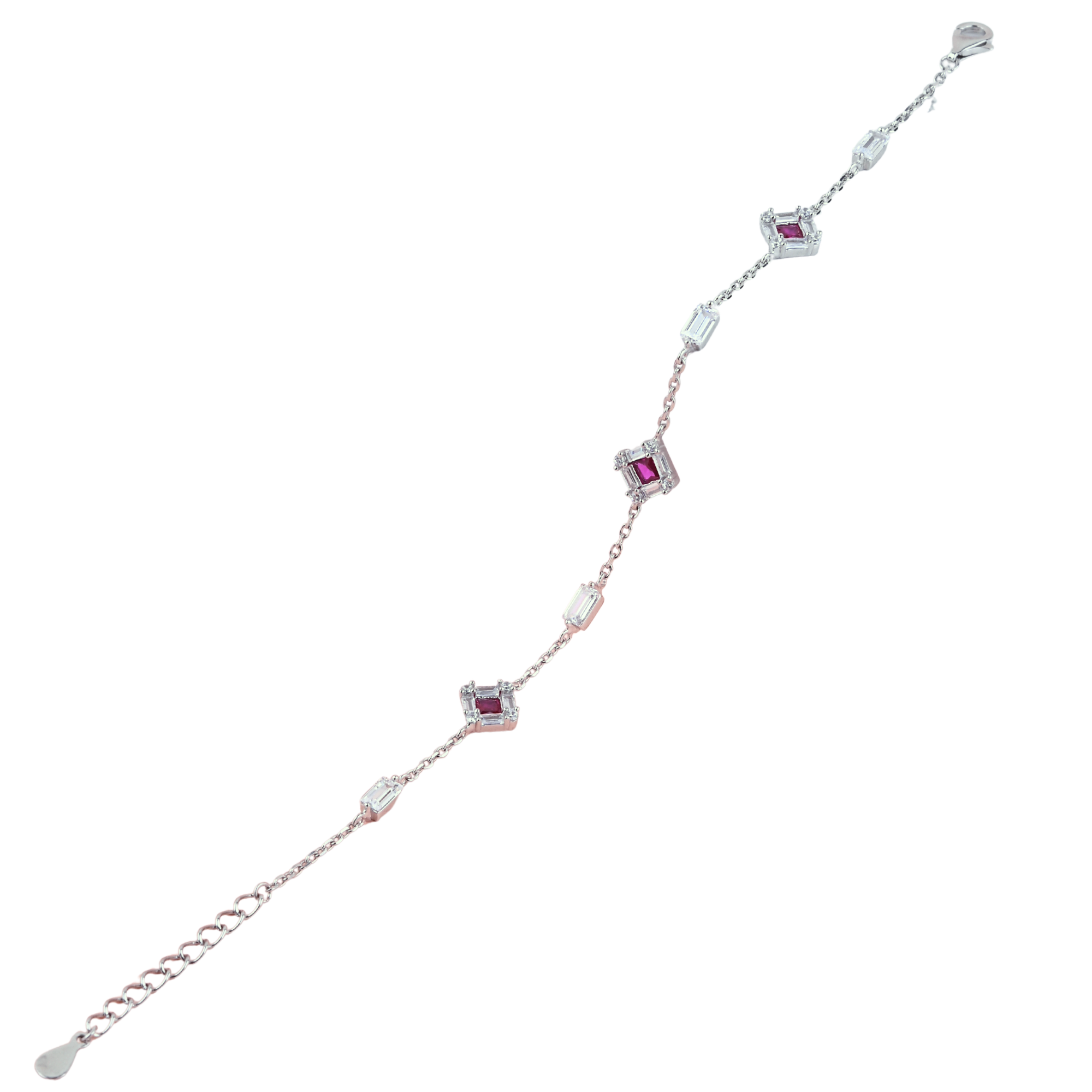 Delicate bracelet featuring ruby-toned square stones with elegant silver detailing.