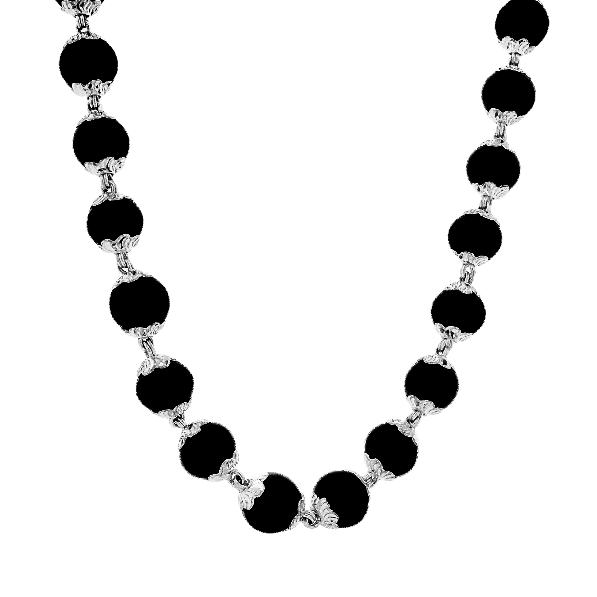 A sacred Karungali Mala Necklace with Silver Caps, designed to symbolize protection, grounding energy, and spiritual stability. The deep black Karungali beads paired with silver accents create a powerful and elegant spiritual accessory.