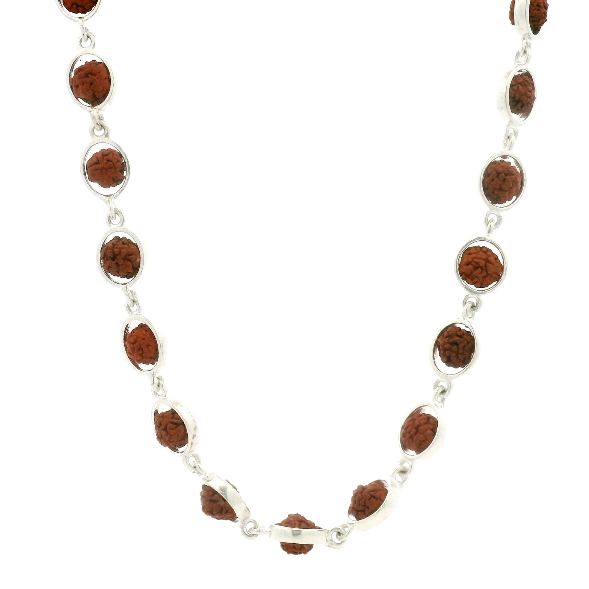 The Pranvdhara Oval Mala is a refined spiritual necklace designed with sacred Rudraksha beads beautifully set inside smooth oval silver frames. This elegant combination blends traditional spirituality with modern craftsmanship, creating a mala that is both meaningful and visually distinctive. Rudraksha beads are deeply revered in Hindu traditions and are strongly connected with Lord Shiva. These sacred beads are believed to hold powerful spiritual vibrations that help support inner peace, clarity of mind, and emotional balance. They have been worn for centuries by devotees and spiritual practitioners to strengthen meditation, prayer, and mindfulness. In this mala, each Rudraksha bead is carefully placed within a polished oval silver setting, enhancing both protection and aesthetic appeal. The oval design represents continuity, balance, and the flow of positive energy, making the mala a symbol of spiritual connection and harmony. The name Pranvdhara reflects the concept of “Pranav” (the sacred sound Om) and “Dhara” meaning flow, symbolizing the continuous flow of divine vibrations and spiritual energy in one’s life. This makes the mala especially suitable for meditation, spiritual rituals, and daily devotional wear.