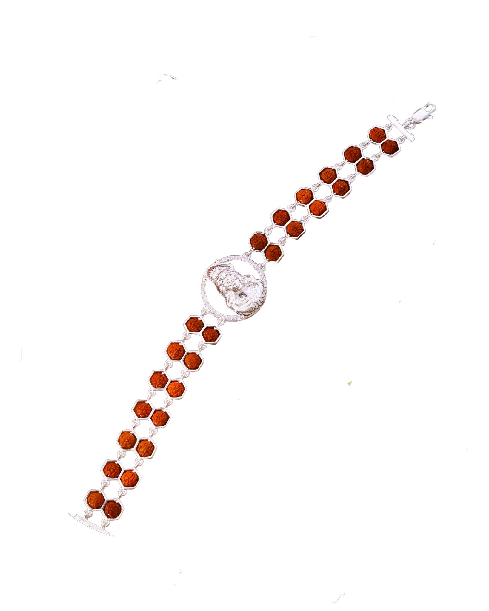 A divine Rudra Deva Silver Bracelet featuring sacred Rudraksha beads in a honeycomb design with a beautifully crafted Lord Shiva centerpiece, symbolizing protection, strength, and spiritual energy.