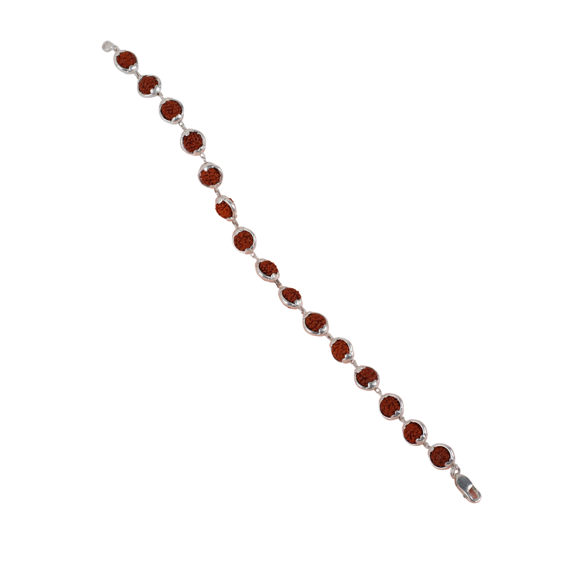 A sacred Dharmaratana Rudraksha Silver Bracelet featuring natural Rudraksha beads set in elegant round silver frames, symbolizing divine protection, spiritual balance, and timeless simplicity.