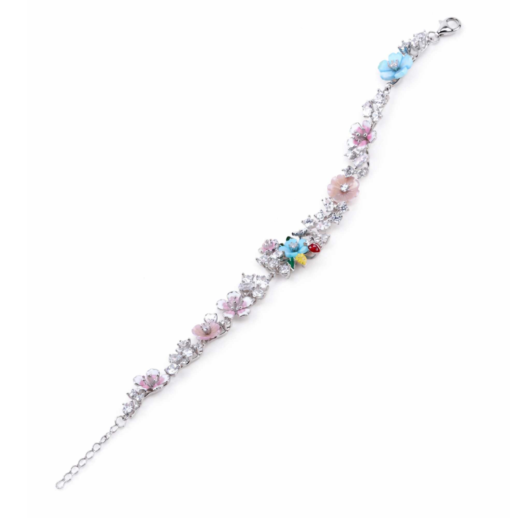 Delicate floral bracelet with colorful charms crafted in 92.5 sterling silver.